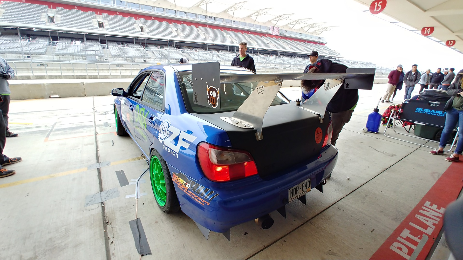 The wing performed well initially, but a few other problems came up. Somehow 2 ARP wheel-studs snapped, and cut the session a little short. From that point, the studs had to be replaced, and at the same time, an issue with the rear differential was also diagnosed, so we had to swap out the R180 as well. Fortunately Zach from ZF Design was on hand to help with that. Somewhat surprisingly, the car was ready to go out for the next session, and the car started to pick-up some pace.