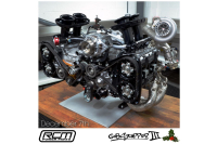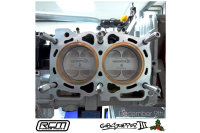 The cylinder head and block o-ring setup on Gobstopper III also comes from development on the S14 WRC engine. To try to maximize the torque output of the engine, the WRC cars were making very high cylinder pressures and ran into reliability issues with a conventional head gasket design. The solution was to machine the block to insert a bronze block 'bush' at the top of each bore. The block is then machined flat leaving behind a special groove which carries a gas O-ring or 'fire' ring. The first versions of these were made of aluminum, but RCM has moved to a special Inconel ring for Gobstopper II and III. You can also see that Roger Clark Motorsports has developed their own pistons for the Gobstopper cars, and other components of the rotating assembly as well. As with the timing belt configuration, RCM has over a decade of testing and development in their Gobstopper engines as well.