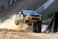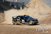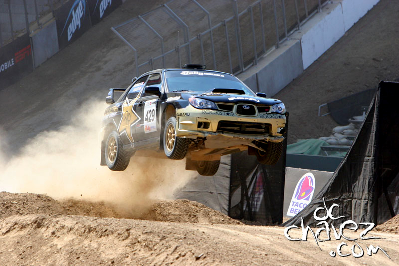We gave up a little more time on stage 3 dropping to 4th overall, 11 seconds of the pace. As we pulled up to the control zone at stage 4 we had a few minutes before our entry time so we jumped out to inspect the car. The front bumper was trashed and hanging down almost on the ground. We grabbed zip ties and quickly re secured it. We entered the control zone and were informed that there was a slight delay to the start. As soon as we got out of the car Colin (Mcrae), 4 cars ahead of us and slightly up hill called down on the radio "tanner have a look at your left front tire it looks a wee bit flat!" Sure enough we had a slow leak caused by small rocks jammed under the bead next to the rim. F$!#&!! our rally was over basically...to change the tire in the control zone is a ten-minute penalty. Pat Richard walked up and commented "hell, change it.. it's the x games, they won't penalize you.” We call Derrick on the radio and he consulted with the stewards at service and yes it would be a penalty. We discussed running the 5-mile stage with the flat, but after talking it over with Derrick, the teams head tech, we decided to start the stage with the flat and change it on course at the first safe pullout. No sense in risking further damage to the car or the occupants. We started the stage and with cameras capturing our every move Tanner and I changed the tire somewhere under 4 minutes, but our hopes of finishing in the top 5 were dashed. Forgetting stage 4 we finished the remaining stages: 5th fastest, 3rd fastest, 3rd fastest, 5th fastest, and taking away the tire change on stage 4 would have ended the day in 3 place overall. Oh well that's rally, dammit!!!