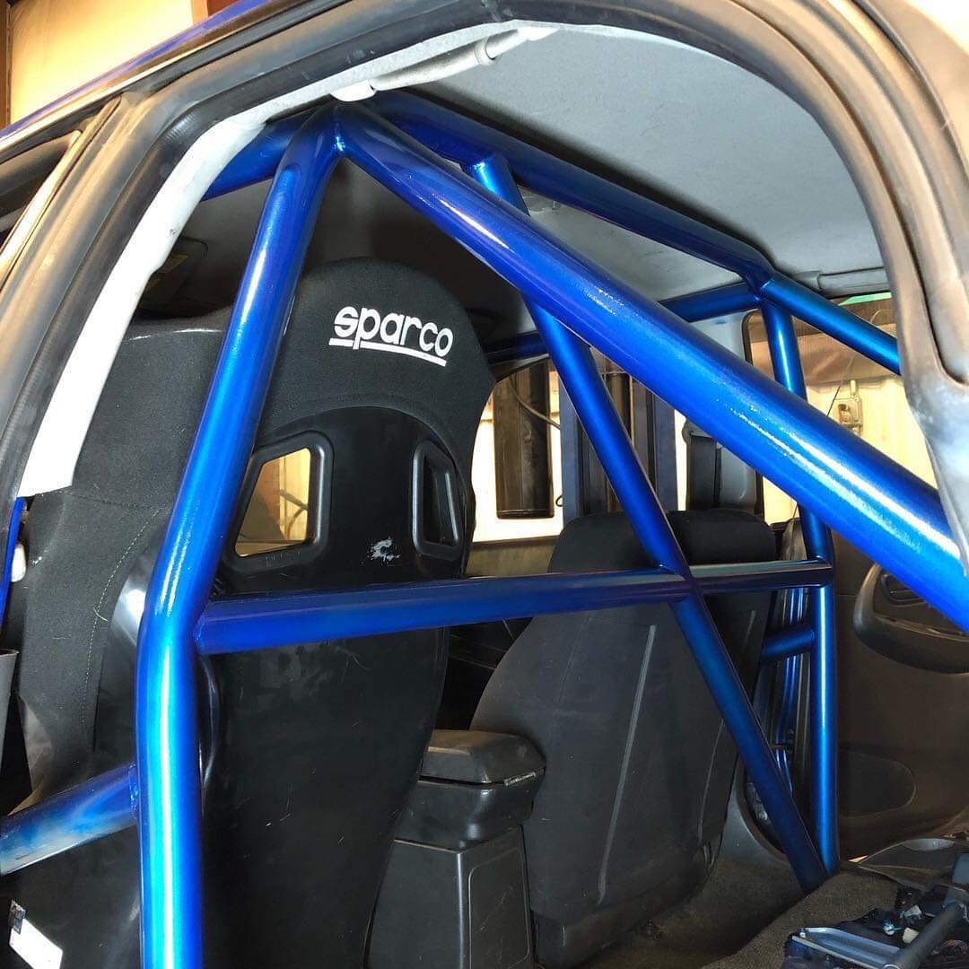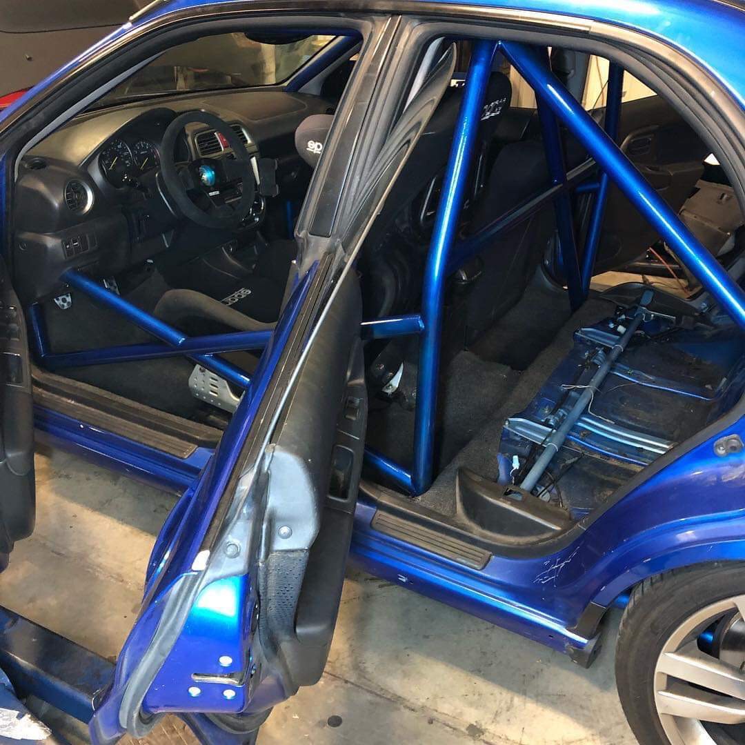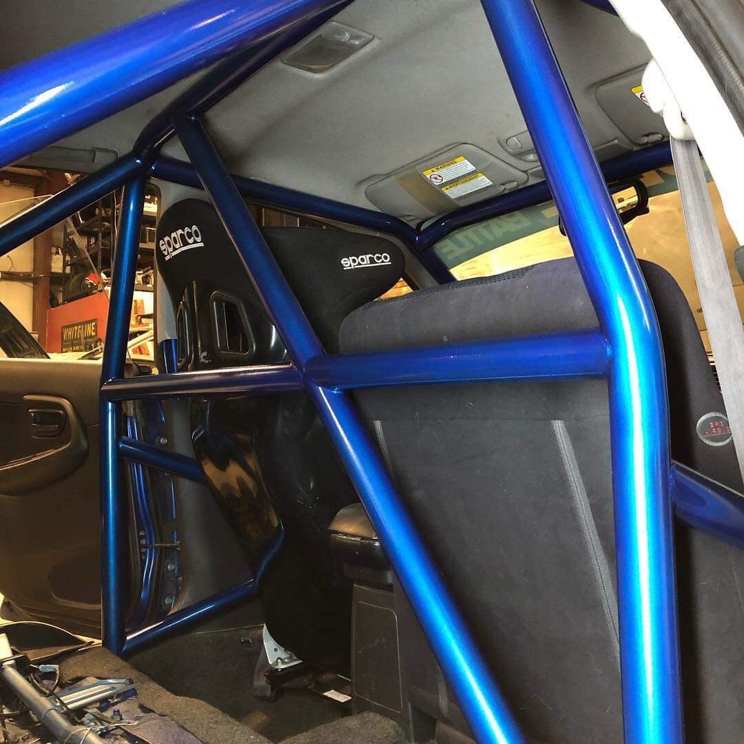 For our preparation coming from the off-season, we started with a Nasa Spec 6-point roll cage while maintaining the full front interior. The Denver Doughnut Shop did an amazing job and the cage turned out great! The cage hugs the interior of the car and the color even matches the exterior World Rally Blue. Brian and Sam spent a great effort on the details and we couldn’t be happier. We added some roll bar padding to the driver and passenger side overhead, bracing to alleviate head impact damage from the cage. The cage also allows us to run a full 6-point seat belt system, courtesy of Flatirons Tuning, along with a passenger seat that will provide a passenger the same level of protection and stability on track as the driver, while saving weight over the OE seats.
