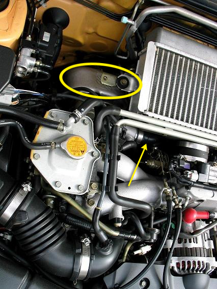 First, look at the heat shield that covers part of the turbo. It is down and to the left of the intercooler. If it has been cut at all, or if there are only a couple of bolts left holding it on, there is a good chance that the car has at least had an aftermarket exhaust on it. The stock heat shield is too small to fit over any aftermarket down pipe, so it is usually cut, or left off all together. There are also a lot of tiny bolts that hold it in place to keep it from rattling, which are hard to put back on, so they are often left off when putting the car back together.