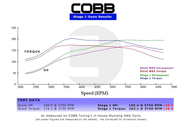 Cobb has posted Dyno Charts of their Stage 1 maps, and in virtually every case, a car can gain a substantial amount of power just from a re-flash of the ECU. For instance, here is their Dyno-Chart of a Stock 2.0 Liter WRX compared to the same car with thier Stage 1 Map on it: